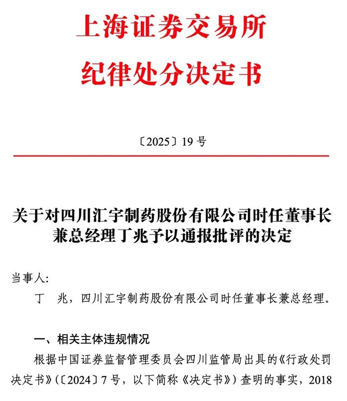 1月17日,上交所发布次序责罚决定,对四川汇宇制药股份有限公司(以下简称“汇宇制药”)时任董事长兼总司理丁兆赐与通报月旦。缘故是其父母在二级阛阓对公司股票进行了短线往来。