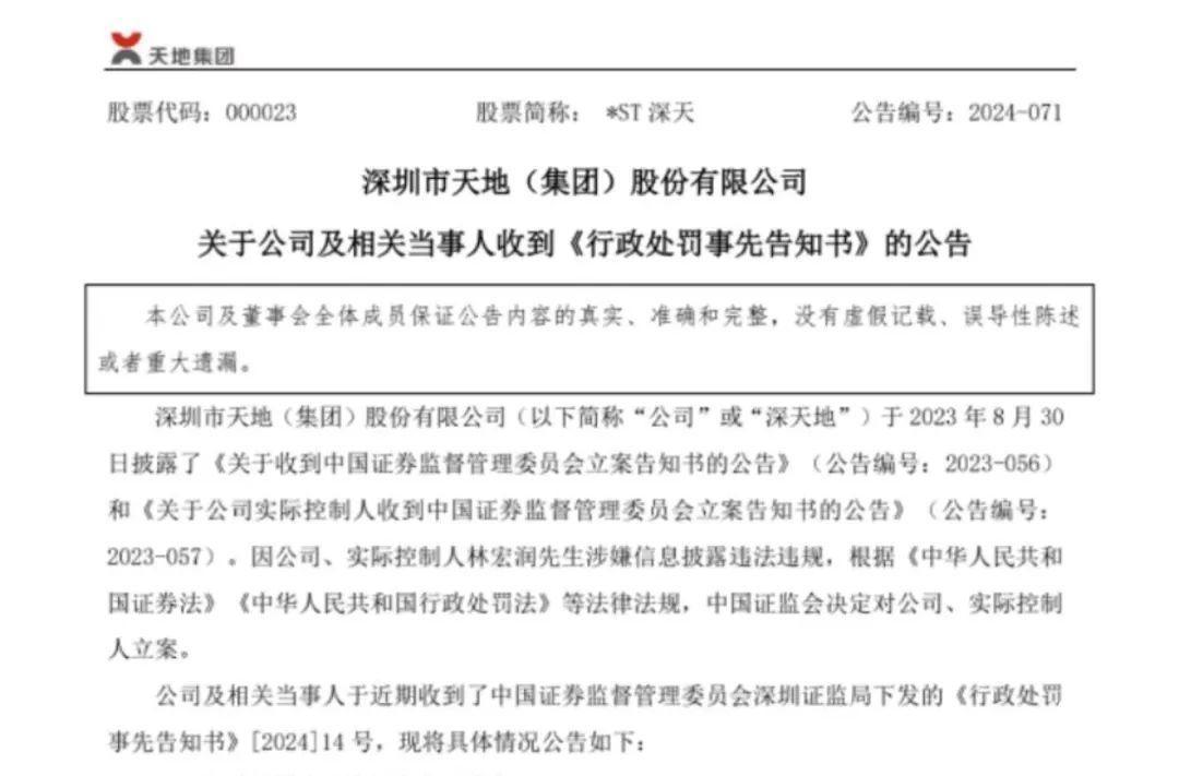 8月4日,此前锁定“市值退市”第一股的*ST深天(000023)发布公告,公司及关系当事东谈主收到深圳证监局下发的《行政处罚事前奉告书》。因涉嫌信息走漏积恶违章,公司被罚金400万元,施行章程东谈主林宏润被罚金800万元。