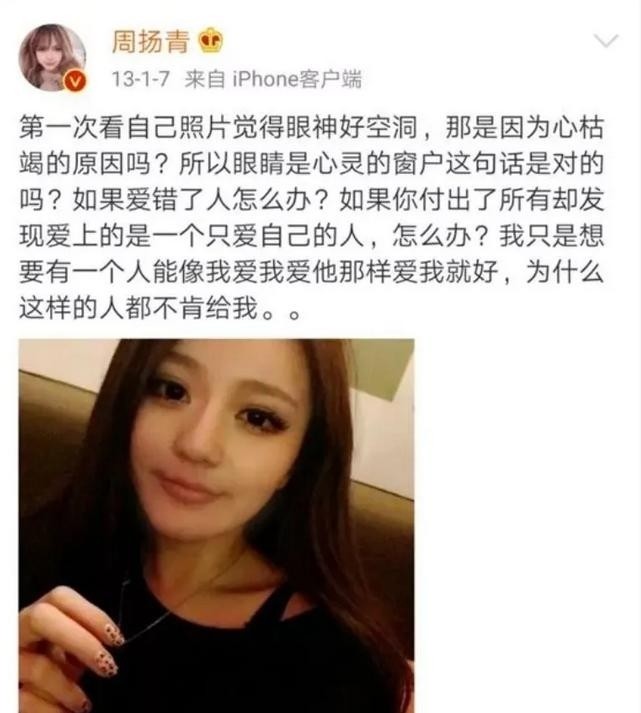 但是到了2013年头,周扬青在主账号发布了一条心思低垂的动态。