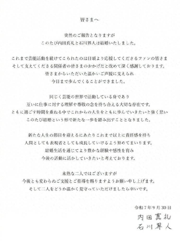 当天,日本闻明声优内田真礼与石川界东谈主当天通过酬酢媒体告示成亲佳音,获取业界与粉丝的平凡道喜,一谈来望望吧!