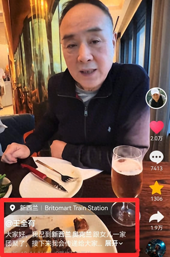 2025 年 12 月 14 日,国度一级演员、“老戏骨” 王全有发布视频,潜入我方已抵达新西兰奥克兰,与男儿一家凯旋聚拢。视频中的他感情愉悦,毫无放洋后的不适,还明确暗示后续会共享更多在新西兰的生存平时。