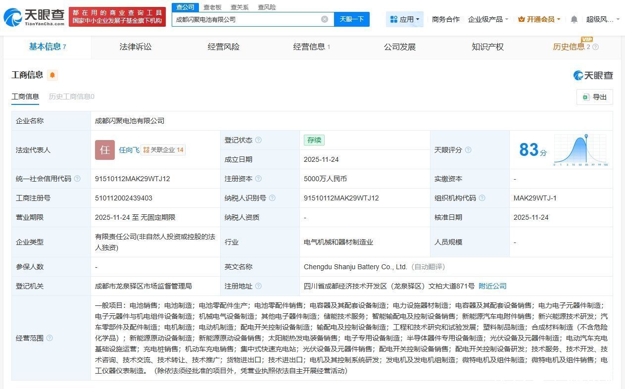 天眼查App泄漏,近日九游会体育-九游会欧洲杯-九玩游戏中心官网,成齐闪聚电板有限公司斥地,法定代表东说念主为任向飞,注册本钱5000万东说念主民币,绸缪领域包括电板销售、电板制造、电板零配件坐褥、电板零配件销售等。推动信息泄漏,该公司由浙江祥瑞汽车零部件产业有限公司全资捏股。