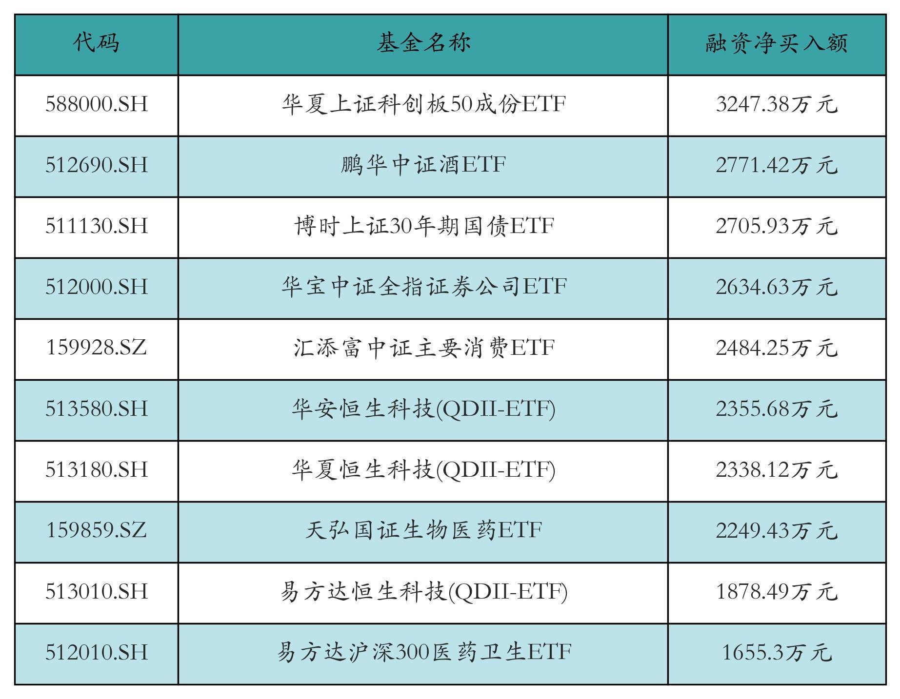 12月2日ETF融资净买入额前三位分离为:中原上证科创板50成份ETF(3247.38万元)、鹏华中证酒ETF(2771.42万元)和博时上证30年期国债ETF(2705.93万元),前10具体见下表: