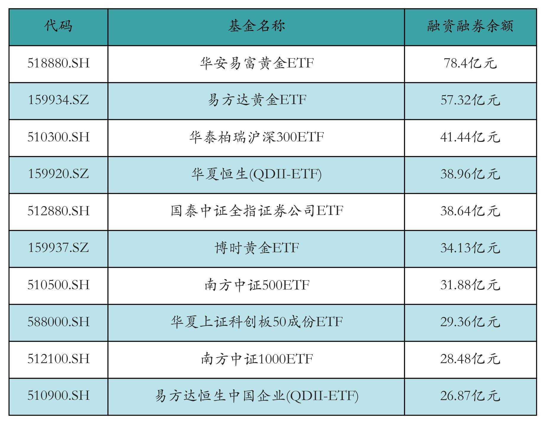 12月2日ETF两融余额前三位分离为:华安易富黄金ETF(78.4亿元)、易方达黄金ETF(57.32亿元)和华泰柏瑞沪深300ETF(41.44亿元),前10具体见下表: