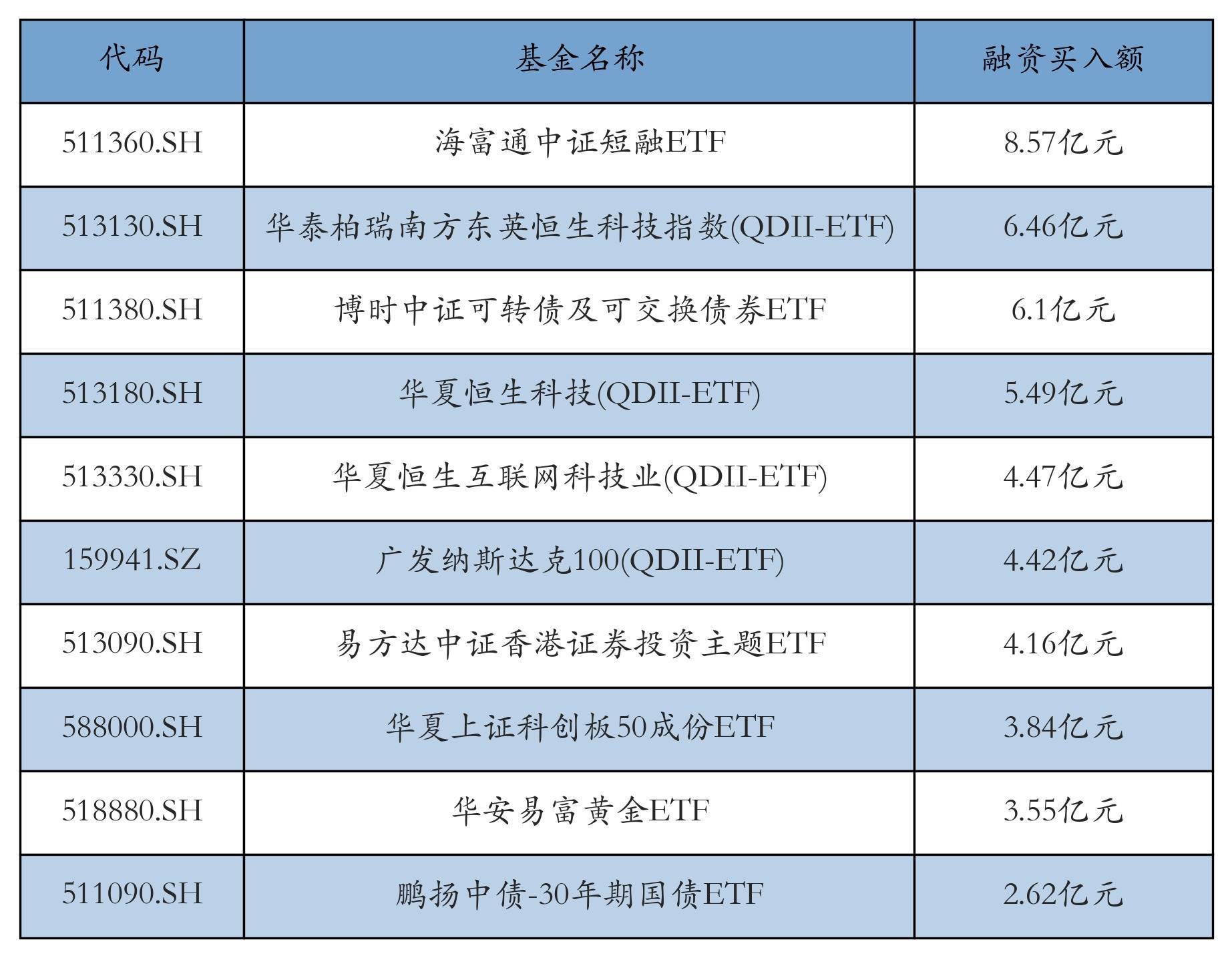 12月2日ETF融资买入额前三位分离为:海富通中证短融ETF(8.57亿元)、华泰柏瑞南边东英恒生科技指数(QDII-ETF)(6.46亿元)和博时中证可转债及可交换债券ETF(6.1亿元),前10具体见下表:
