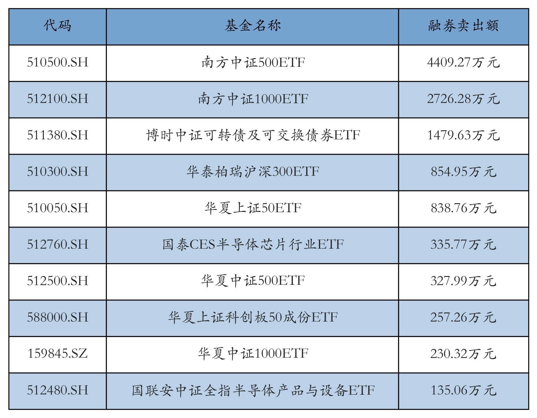 12月2日ETF融券卖出额前三位分离为:南边中证500ETF(4409.27万元)、南边中证1000ETF(2726.28万元)和博时中证可转债及可交换债券ETF(1479.63万元),前10具体见下表:
