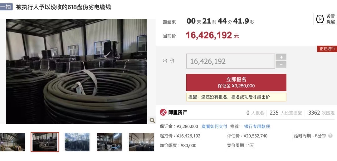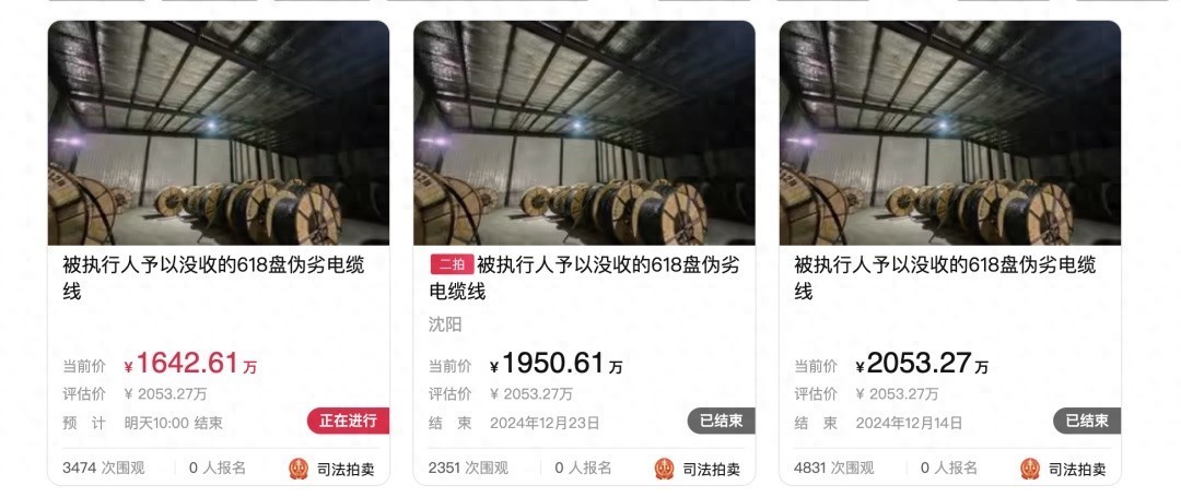 2月5日10点,辽宁省沈阳市一批估价2053万元的伪劣电缆,在阿里拍卖平台上进行第3次司法拍卖。这批电缆由法院照章查封并充公,共618盘,起拍价为1642万元。有网友将拍卖信息发布在外交平台后,激发网友热议。有东谈主猜忌:“伪劣电缆线不可流入阛阓,那为何还要拍卖?”也有网友合计:“这种拍卖表情其实即是变相让企业回收原材料,幸免销耗。”还有东谈主担忧:“既然是伪劣居品,何如保证不会再次流入阛阓?”